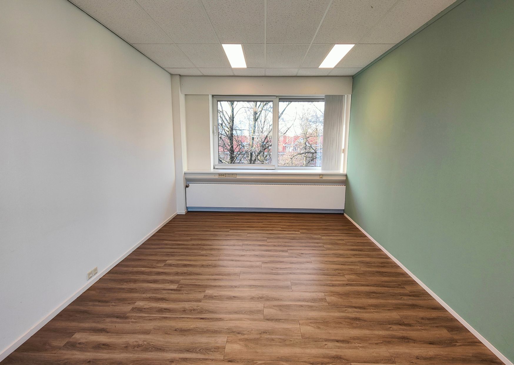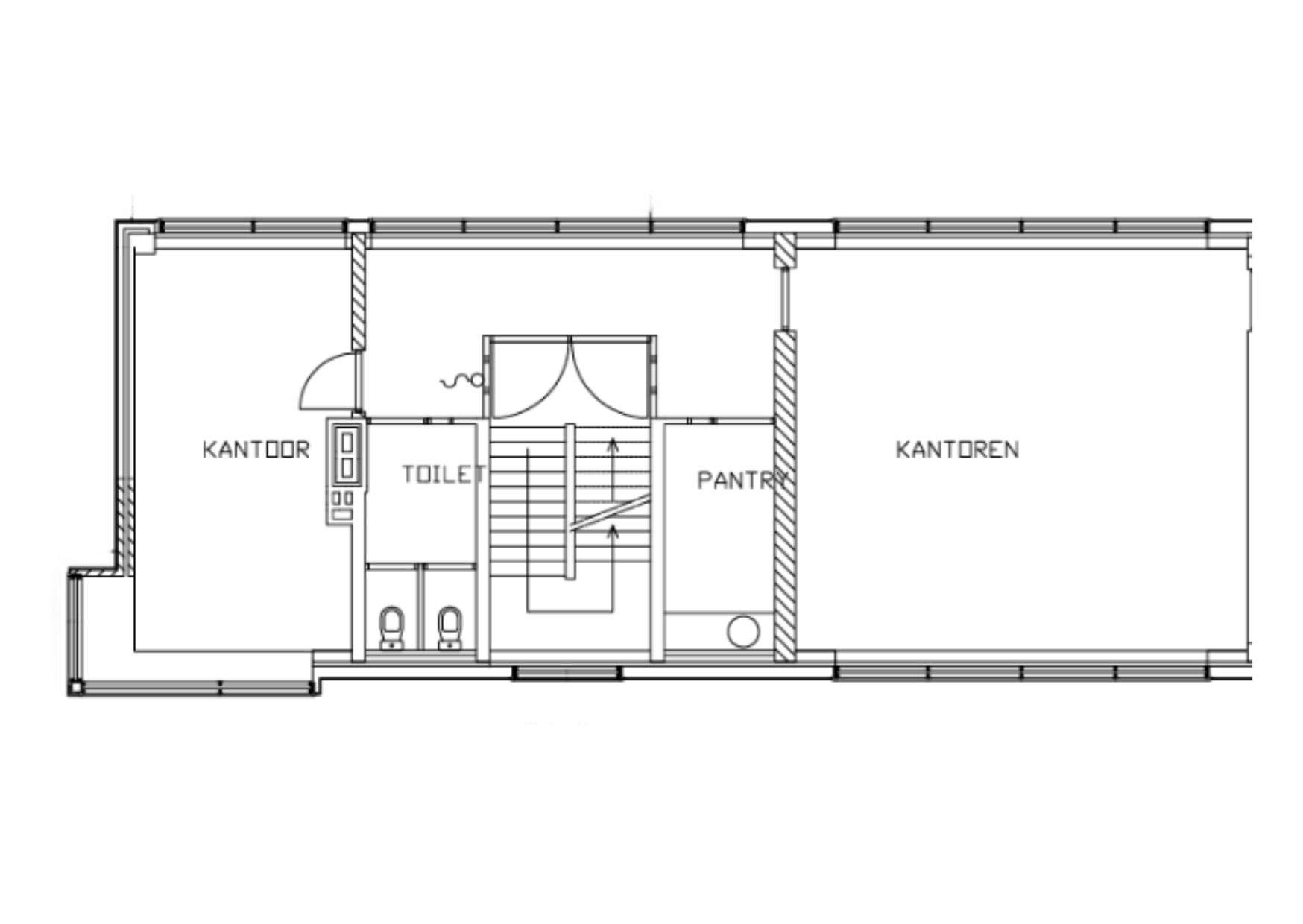 Het kantoor bestaat uit twee grote ruimtes en beschikt over toiletten en een pantry. Door het aantal ramen voelt elke ruimte open en licht aan. Je kunt de grootste ruimte bijvoorbeeld gebruiken als kantoortuin met meerdere werkplekken, terwijl de andere ruimte perfect geschikt is als vergader- of ontvangstruimte. Heb jij een heel andere invulling in gedachten? Laat het ons weten, we denken graag mee.