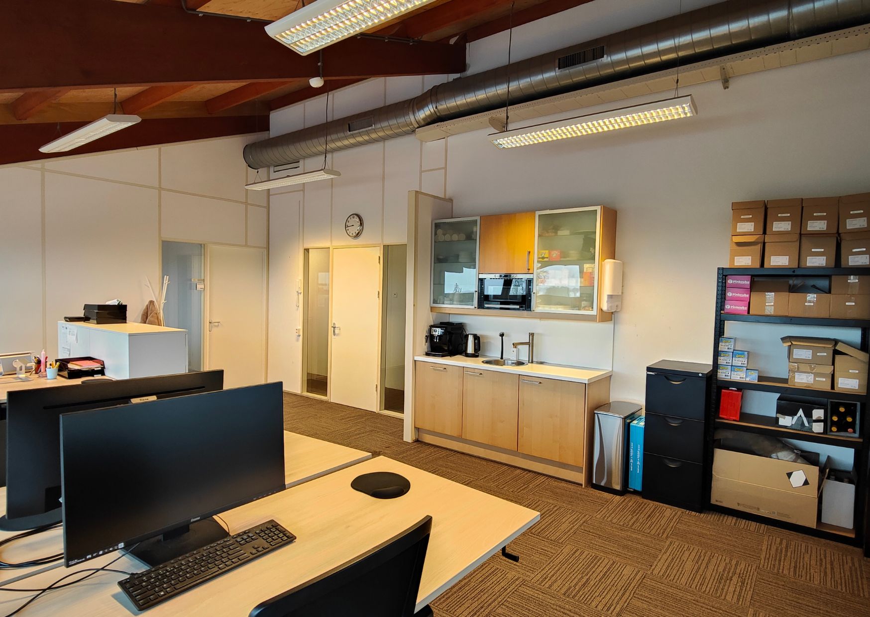Dankzij de open indeling van de verdieping zijn de ruimtes op verschillende manieren in te richten en te gebruiken, helemaal naar wens van de huurder.